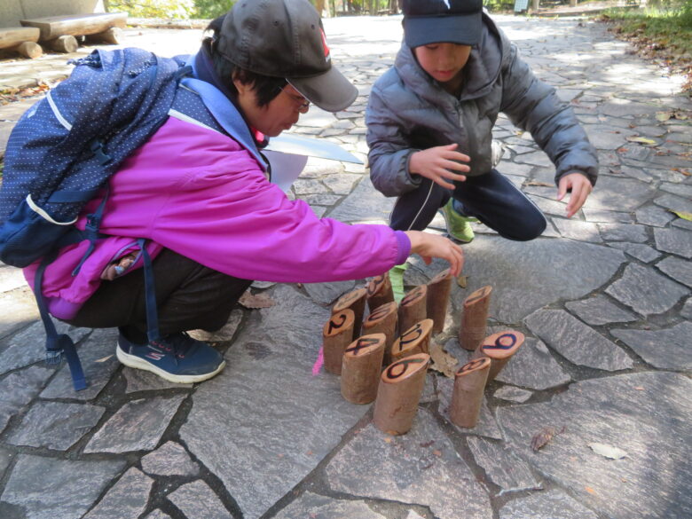 数字の書かれたカワナックを、円柱状の木を投げて倒すゲームです。